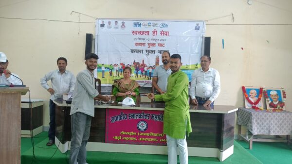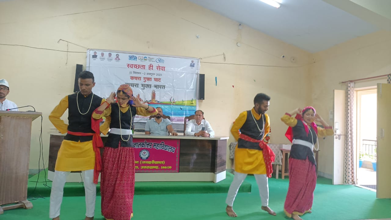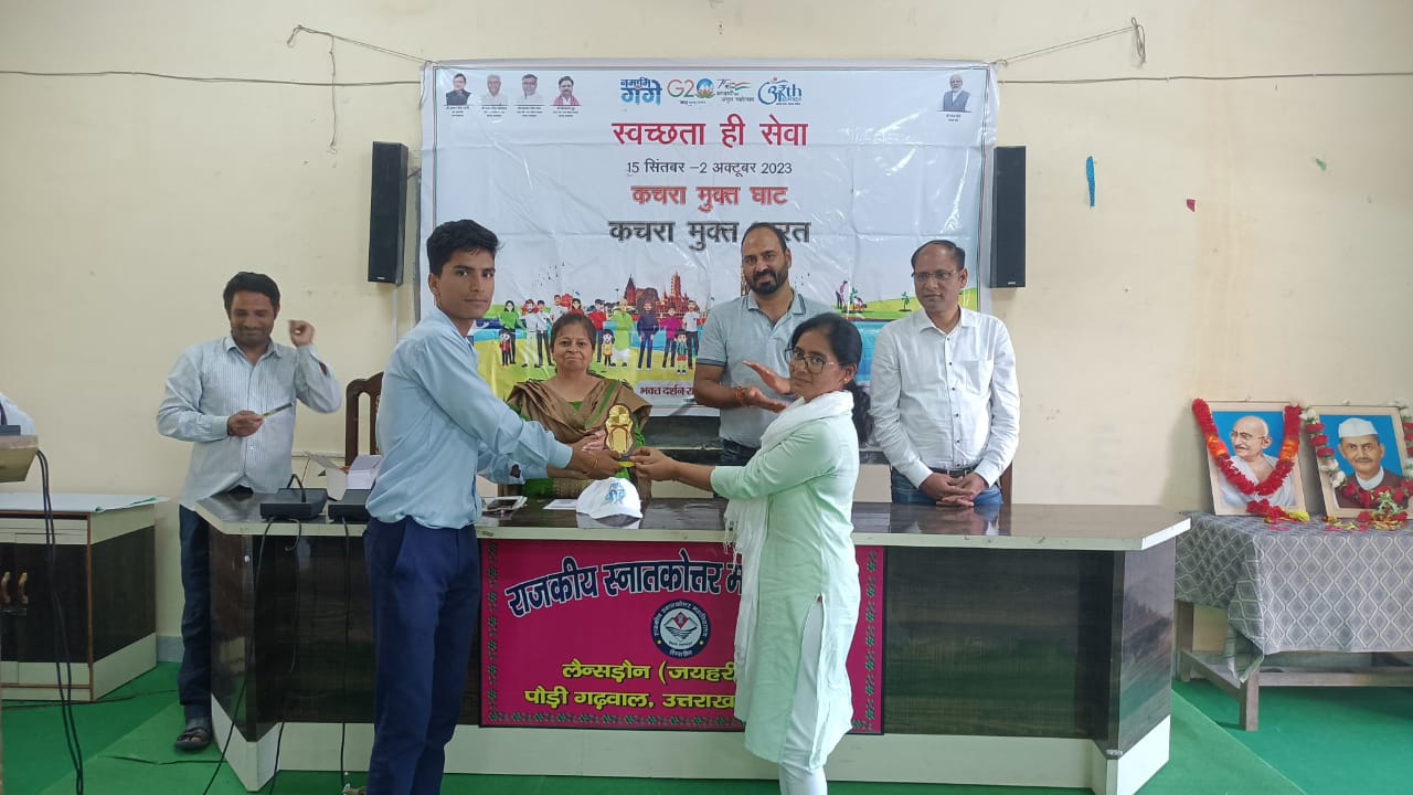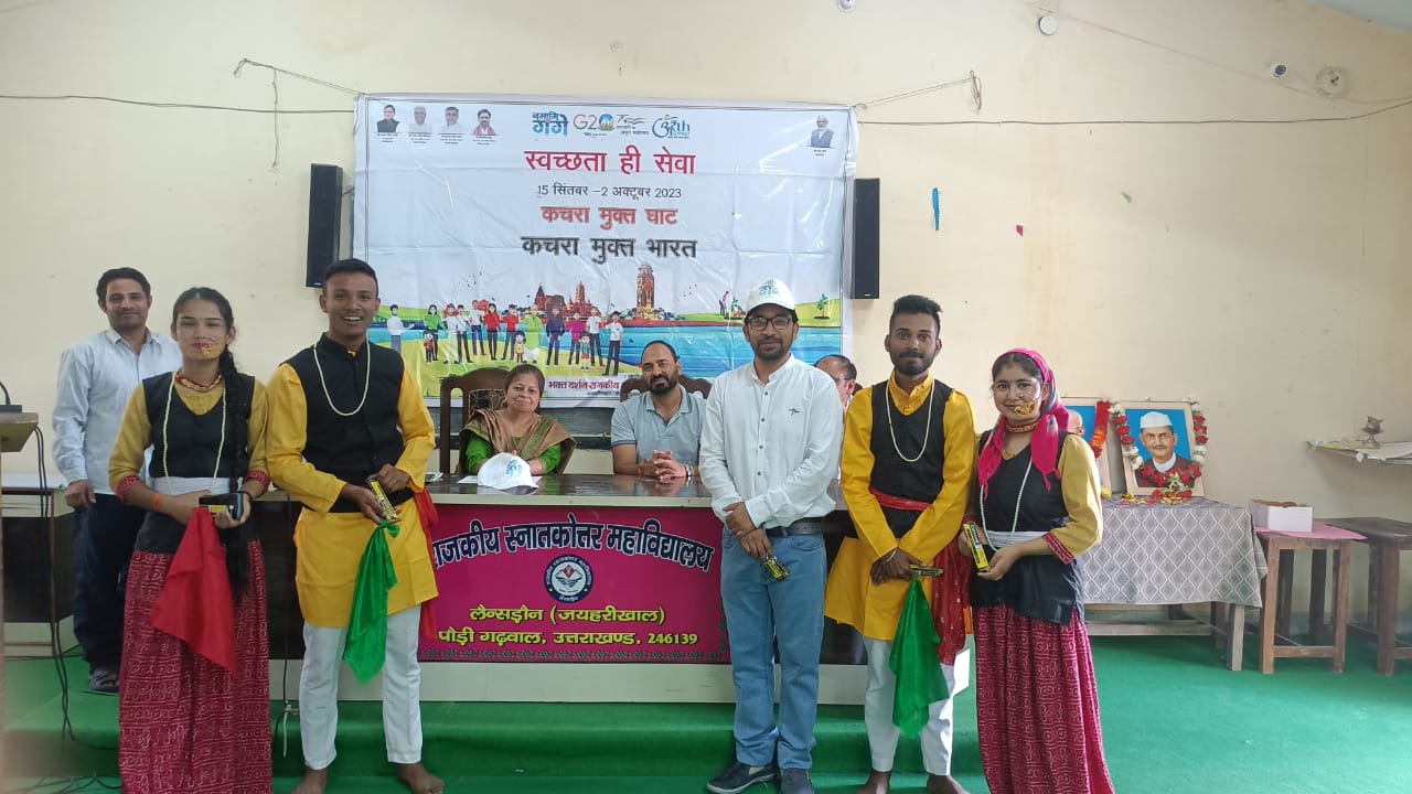 लैंसडाउन : भक्त दर्शन राजकीय स्नातकोत्तर महाविद्यालय जयहरीखाल में आज 02 अक्टूबर 2023 को भारत सरकार की महत्वाकांक्षी योजना नमामि गंगे व राष्ट्रिय सेवा योजना के संयुक्त तत्वाधान में “स्वच्छता ही सेवा” कचरा मुक्त घाट कचरा मुक्त भारत पखवाड़ा (15 सितंबर 2023 से 02 अक्टूबर 2023) के तहत आज समापन समारोह में सांस्कृतिक/सत्य,अहिंसा और सादगी की प्रतिमूर्ति गाँधी जी और शास्त्री जी की जयंती पर एक संगोष्ठी का किया गया आयोजन। महाविद्यालय की प्राचार्य प्रो डॉ एल आर राजवंशी द्वारा झंडारोहण के पश्चात राष्ट्रपिता महात्मा गाँधी और पूर्व प्रधानमंत्री श्री लाल बहादुर शास्त्री जी प्रतिमा पर माल्यार्पण और श्रद्धा सुमन अर्पित कर कार्यक्रम का शुभारम्भ किया।