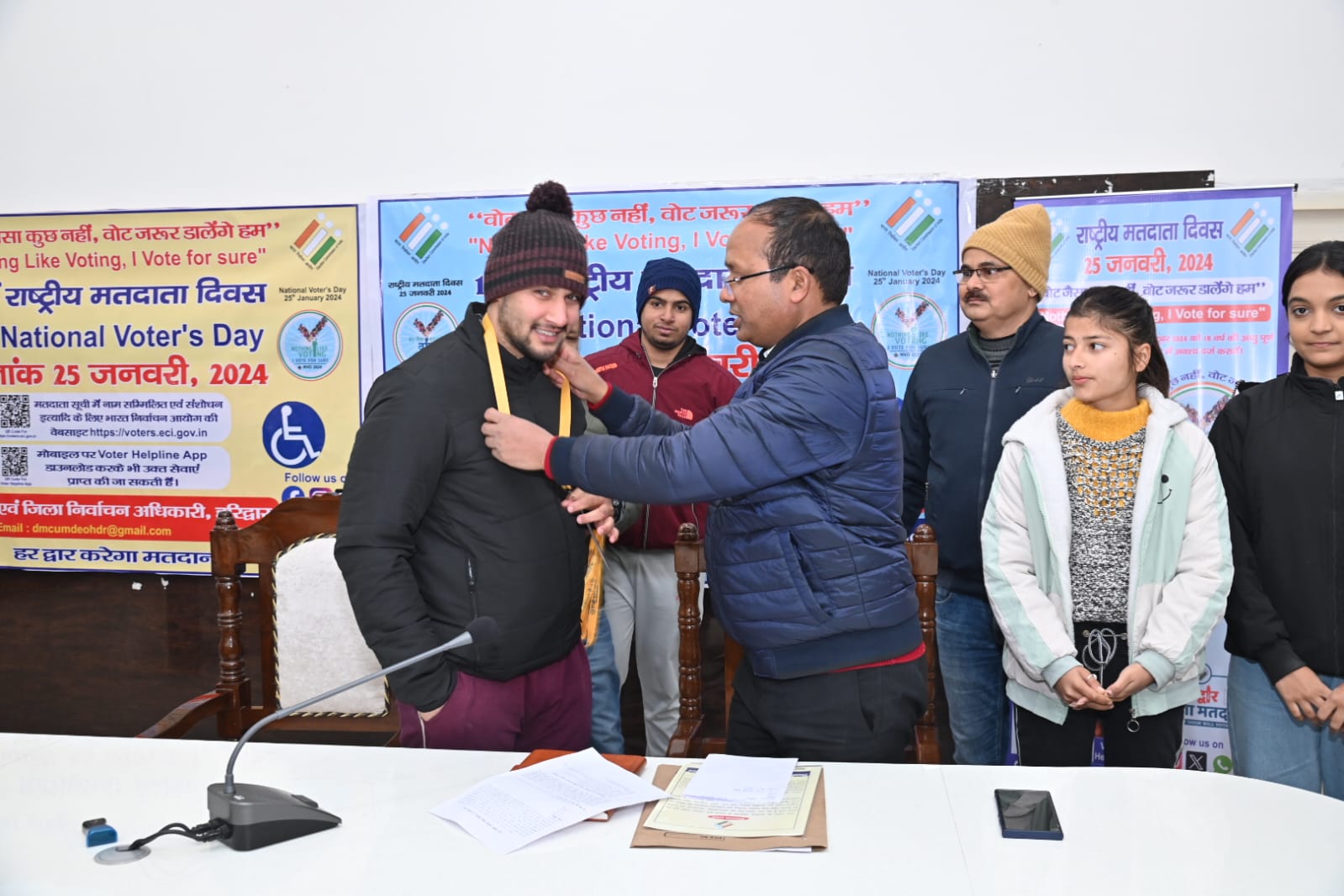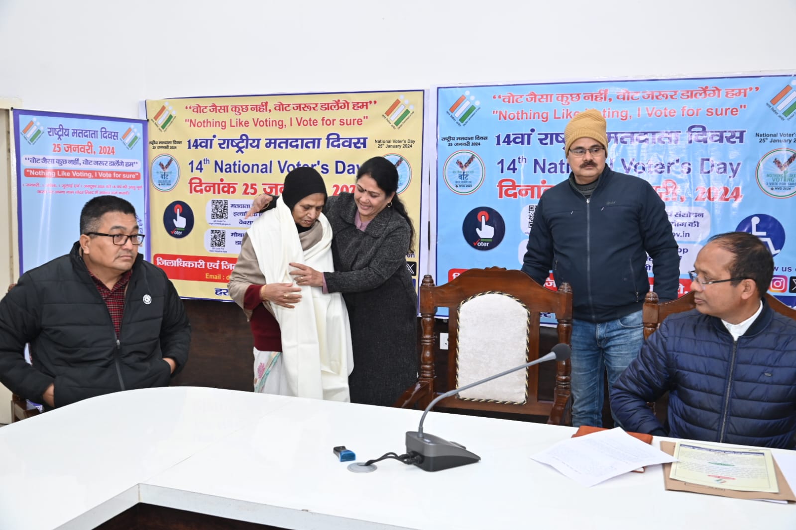 कार्यक्रम के दौरान अखिलेश नारायण सक्सेना, अवधेश प्रताप सिंह, ऊषा सिंह, डॉ. रमेश चन्द्र सचान को वरिष्ठ मतदाता के रूप में शॉल ओढ़ाकर सम्मानित किया गया तथा आंचल, श्वाति, गगन, मगन व दिशा को नये मतदाता के रूप में शामिल होने के प्रमाण पत्रों का वितरण किया गया। वरिष्ठ मतदाताओं ने कार्यक्रम में अपने अनुभव साझा करते हुये बताया कि हमें वोट डालने के बाद एक ताकत का एहसास होता है तथा हमें भारत का नागरिक होने पर गर्व है। इस अवसर पर अपर जिलाधिकारी(वित्त एवं राजस्व) दीपेन्द्र सिंह नेगी, डिप्टी कलक्टर मनीष सिंह, डिप्टी कलक्टर लक्ष्मीराज चौहान, सहायक जिला निर्वाचन अधिकारी अरूणेश पैन्यूली, आपदा प्रबन्धन अधिकारी मीरा रावत, मुख्य प्रशासनिक अधिकारी देवेन्द्र अधिकारी, प्रशासनिक अधिकारी उदयवीर सिंह बर्थ्वाल सहित कलक्ट्रेट के समस्त कार्मिक उपस्थित थे।
