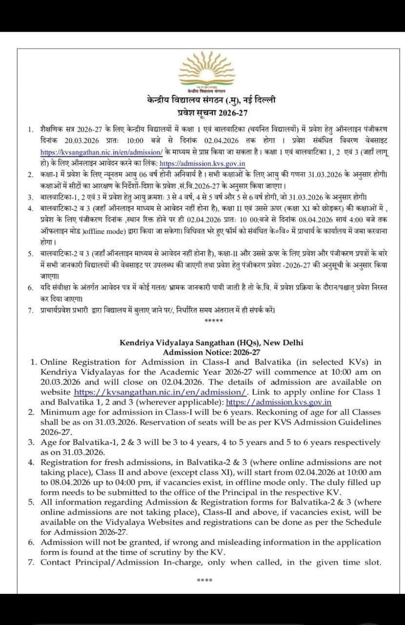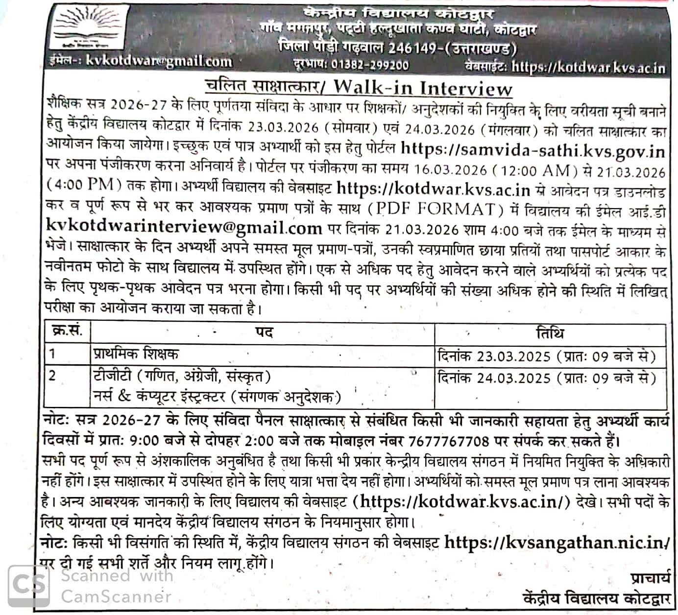 कोटद्वार : केंद्रीय विद्यालय कोटद्वार में शैक्षणिक सत्र 2026-27 हेतु प्रवेश प्रक्रिया प्रारंभ हो रही है, साथ ही विद्यालय में विभिन्न विषयों के लिए संविदा शिक्षकों की भर्ती भी की जा रही है। विद्यालय में PRT, TGT (गणित, अंग्रेजी, संस्कृत), नर्स एवं कंप्यूटर इंस्ट्रक्टर पदों हेतु Walk-in Interview आयोजित होंगे।