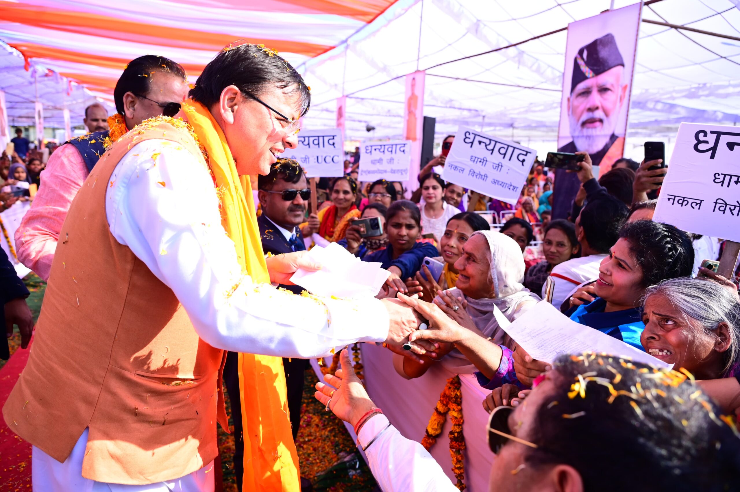 मुख्यमंत्री ने कहा कि विकास के साथ ही हमनें राज्य के हित में कई ऐसे ऐतिहासिक फैसले लिए जो उत्तराखंड को एक बेहतर और श्रेष्ठ उत्तराखंड बनाने में निश्चित ही अपना योगदान दे रहे हैं। उन्होंने कहा कि हमारी सरकार ने समान नागरिक संहिता को लागू किया जिससे मातृशक्ति को कई कुरीतियों और उत्पीड़नों से मुक्ति मिलेगी। हमने देश में सबसे कड़ा नकल विरोधी कानून लागू किया जिससे कि पेपर लीक पर लगाम लग गई। अब पारदर्शिता से सभी परीक्षाएं हो रही हैं। चयनित अभ्यर्थियों को नियुक्ति पत्र देने के कार्यक्रम प्रतिदिन आयोजित हो रहे हैं। हमारी सरकार ने लैंड जिहाद के खिलाफ मजबूती से मुहिम चलाकर अब तक 5000 एकड़ से अधिक सरकारी जमीनों से गैरकानूनी कब्जे को खत्म किया। उन्होंने कहा कि उत्तराखंड देवभूमि है, जो भी यहां अशांति पैदा करने की कोशिश करेगा उसको किसी भी हालत में बख्शा नहीं जाएगा। उन्होंने कहा कि इसके साथ ही हमारी सरकार ने जबरन धर्मांतरण के खिलाफ सख्त कानून बनाया है क्योंकि हम अपने प्रदेश की डेमोग्राफी के साथ छेड़छाड़ बिल्कुल बर्दाश्त नहीं कर सकते। धर्मांतरण विरोधी कानून हमारी देवभूमि की संस्कृति और पवित्रता की रक्षा करेगा।