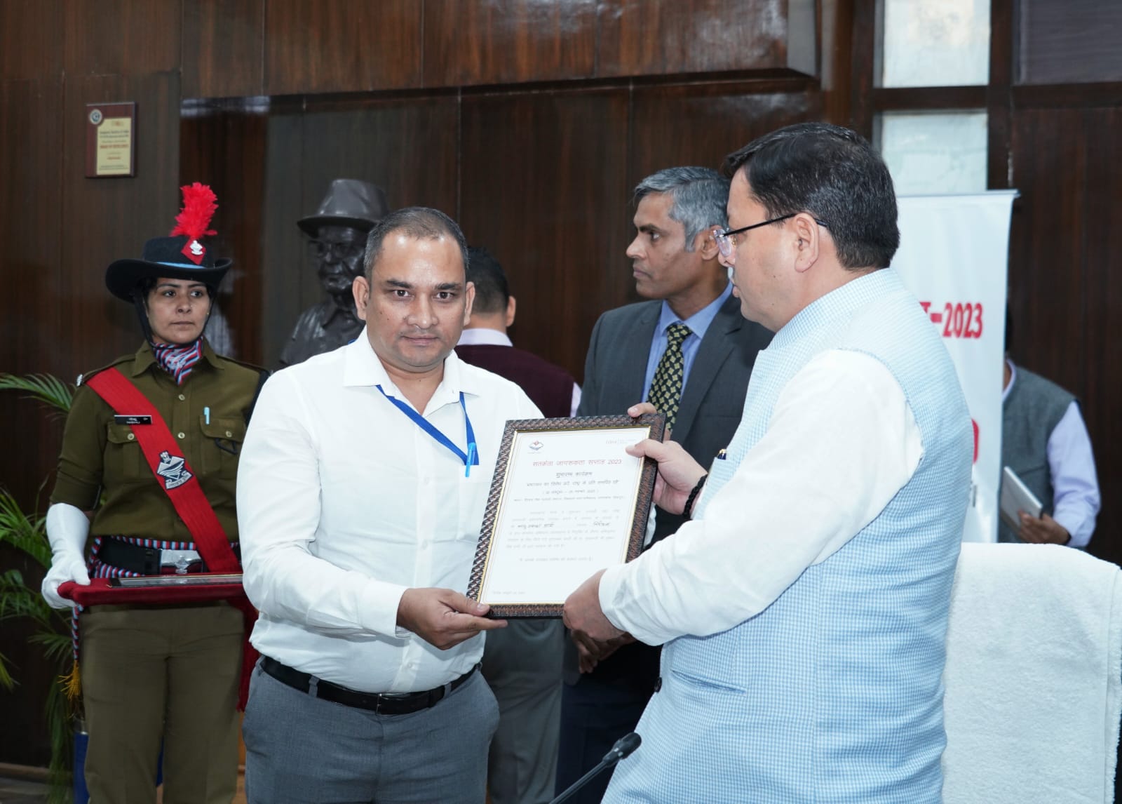 देहरादून : मुख्यमंत्री पुष्कर सिंह धामी ने 30 अक्टूबर से 05 नवम्बर 2023 तक चलने वाले सतर्कता सप्ताह के अन्तर्गत ‘‘भ्रष्टाचार का विरोध करें, राष्ट्र के प्रति समर्पित रहें’’ कार्यक्रम का शुभारंभ किया। सचिवालय में आयोजित कार्यक्रम में मुख्यमंत्री ने घोषणा की कि सतर्कता विभाग में 103 नये पद सृजित किये जायेंगे। सतर्कता विभाग की कार्यप्रणाली को प्रभावी रूप से और बेहतर बनाने के लिए सर्विलांस व तकनीकि विशेषज्ञों की टीम का गठन किया जायेगा। इस अवसर पर मुख्यमंत्री ने अपने कार्यक्षेत्र में सराहनीय कार्य करने वाले सतर्कता विभाग के इंस्पेक्टर तुषार बोहरा, इंस्पेक्टर भानु प्रकाश आर्य, एएसआई दिवाकर शर्मा और कांस्टेबल नवीन कुमार को सम्मानित किया। मुख्यमंत्री ने अधिकारियों और कर्मचारियों को सत्यनिष्ठा की प्रतिज्ञा भी दिलाई।