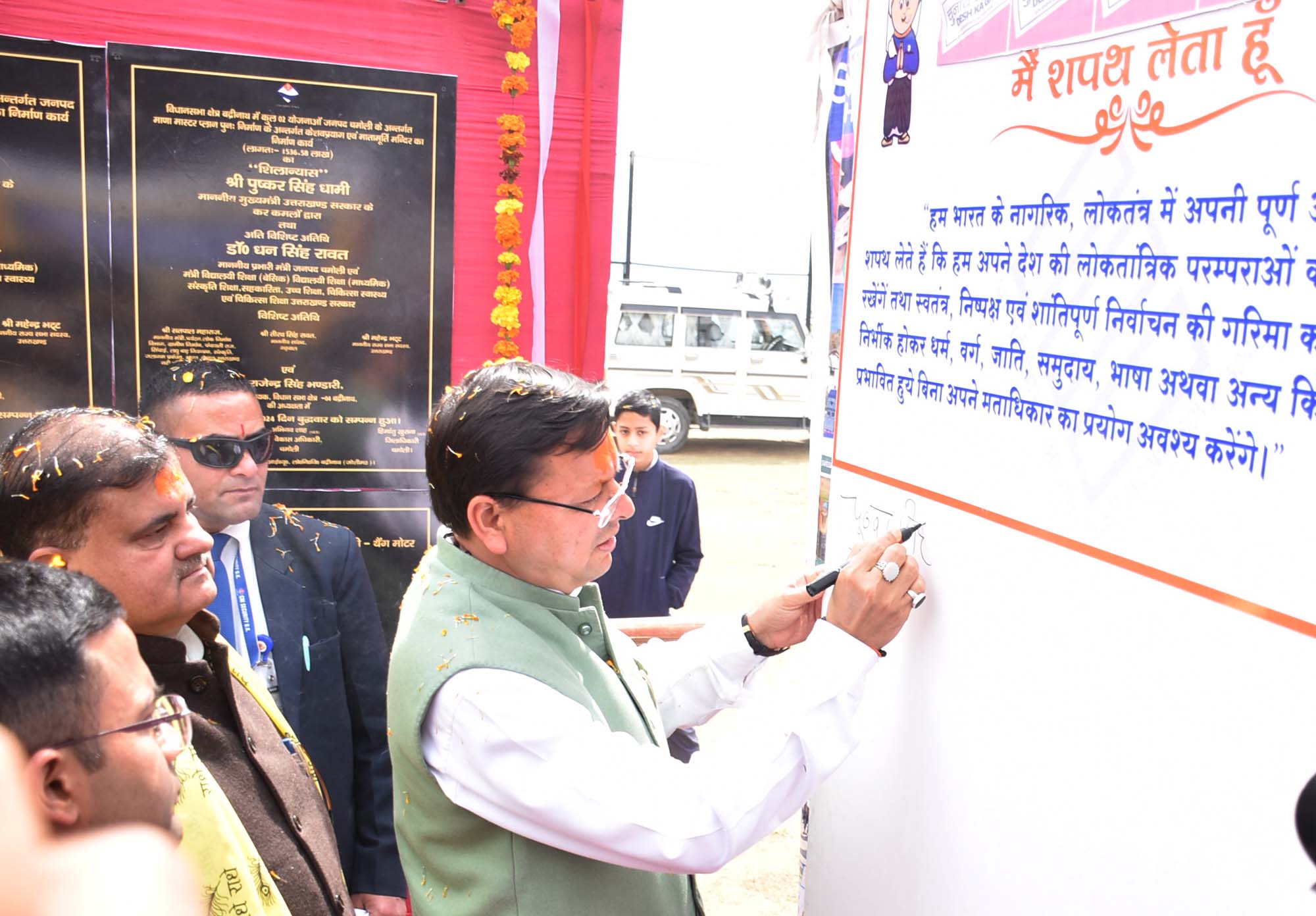 गढ़वाल सांसद तीरथ सिंह रावत ने कहा कि देश प्रधानमंत्री वसुधैव कुटुम्बकम् की परिकल्पना के साथ रात-दिन समाज के हर वर्ग के लिए काम करने में जुटे है। थराली विधायक भूपाल राम टम्टा और कर्णप्रयाग विधायक अनिल नौटियाल ने मुख्यमंत्री का जनपद आगमन पर स्वागत करते हुए जनपद के विकास के लिए सरकार द्वारा किए जा रहे कार्यों एवं उपलब्धियों के लिए मुख्यमंत्री का आभार व्यक्त किया। इस अवसर पर राज्यसभा सांसद महेन्द्र भट्ट, गढ़वाल सांसद तीरथ सिंह रावत, राज्यमंत्री रेमश गडिया, थराली विधायक भूपाल राम टम्टा, कर्णप्रयाग विधायक अनिल नौटियाल, भाजपा जिला अध्यक्ष रमेश मैखुरी, जिलाधिकारी हिमांशु खुराना, पुलिस अधीक्षक रेखा यादव, मुख्य विकास अधिकारी अभिनव शाह, अपर जिलाधिकारी डॉ अभिषेक त्रिपाठी, एसडीएम आरके पांडेय आदि सहित बडी संख्या में स्थानीय जनता एवं विभिन्न योजनाओं से आच्छादित लाभार्थी मौजूद रहे।