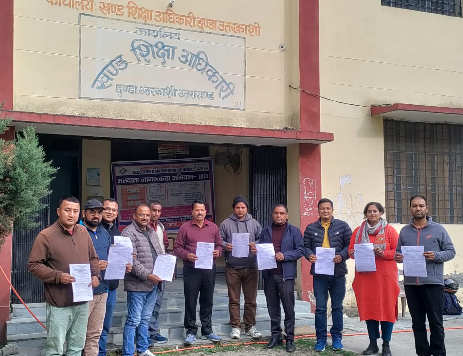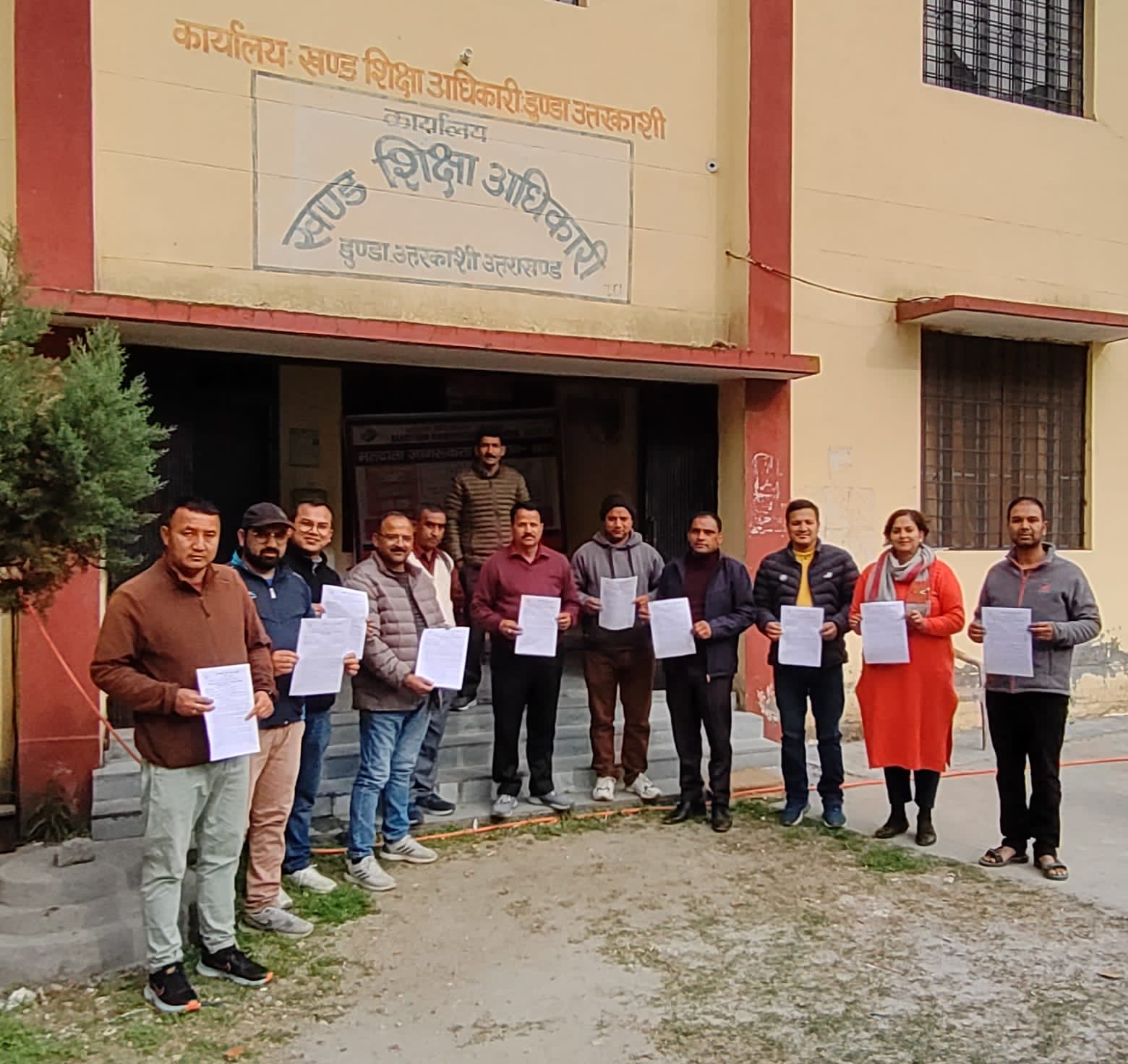 उत्तरकाशी (कीर्ति निधि सजवाण ):  खंड शिक्षा अधिकारी डुंडा कार्यालय में शासन द्वारा सीधी भर्ती द्वारा प्रधानाचार्य हेतु विज्ञप्ति के विरोध में विकासखंड के माध्यमिक विद्यालयों में कार्यरत शिक्षक एकत्रित हुए। कार्यक्रम की शुरुआत करते हुए ब्लॉक अध्यक्ष विनोद  प्रसाद नौटियाल ने कहा कि विभाग और शासन अपनी मन मर्जी कर रहा है। सभी शिक्षक कई वर्षों से अपनी पदोन्नति की बाट जोह रहे हैं और अधिकांश सेवानिवृत हो गये हैं। कार्यक्रम को आगे  बढ़ाते हुए ब्लॉक मंत्री डॉ. संजीव डोभाल ने कहा कि विभाग की कार्यप्रणाली से सभी माध्यमिक शिक्षक हतोत्साहित हैं । विभाग ने अंतिम पदोन्नती २०१७ में हुई थी। विचार व्यक्त करने वाले शिक्षकों मे आलोक नेगी, नीलम बधानी, प्रकाश भंडारी, दीनदयाल सिंह, विकास गौड़ ,विंदेश्वर डंगवाल, कृष्णमोहन भट्ट, पवन भारती, रंजीत आदि रहे।