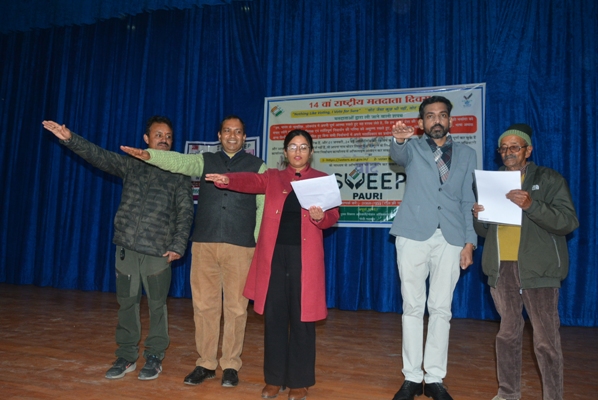 पौड़ी : 14वें राष्ट्रीय मतदाता दिवस के अवसर पर आज प्रेक्षागृह पौड़ी में जिलाधिकारी/जिला निर्वाचन अधिकारी डॉ. आशीष चौहान ने नये मतदाता, दिव्यांग, बुजुर्ग मतदाता व अधिकारी-कर्मचारियों को शपथ दिलाई। उन्होंने उदाहरण देते हुए कहा कि जैसे हम दुकानों से अपनी पंसद की चीज खरीदते हैं वैसे ही हमें एक अच्छा प्रत्याशी सोच समझकर चुनते हुए गंभीरता से अपना मत का उपयोग करना है। इस दौरान उन्होंने नये मतदाताओं को पहचान पत्र, दिव्यांग व बुजुर्ग मतदाताओं का शॉल ओढ़कर सम्मानित भी किया।