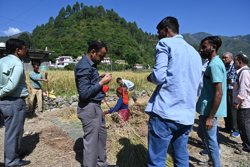 फसलों की औसत उपज और उत्पादन के आंकड़े संकलन को लेकर डीएम मयूर दीक्षित पहुंचे जड़धारगांव चंबा