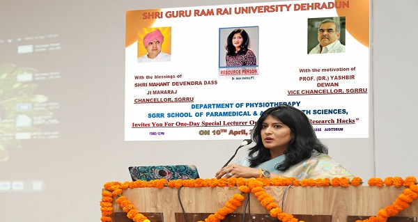 देहरादून। श्री गुरु राम राय विश्वविद्यालय (एसजीआरआरयू) के स्कूल ऑफ पैरामेडिकल एण्ड एलाइड हैल्थ सांइसेज के द्वारा एक दिवसीय अंतरराष्ट्रीय स्वास्थ्य विज्ञान अनुसंधान व्याख्यान का आयोजन किया गया। कार्यशाला की मुख्य अतिथि डॉ. अंजू वर्मा  यूनिवर्सिटी आफ सिडनी, ऑस्ट्रेलिया ने पैरामैडिकल छात्र-छात्राओं को अन्तर्राष्ट्रीय स्तर पर होने वाले शोध एवं अनुसंधानों से जुड़े अहम पहलुओं से रूबरू करवाया। एक दिवसीय कार्यशाला में युवा शोधार्थियों ने शोध से जुड़ी विभिन्न अवधारणाओं को जाना एवं समझा। श्री गुरु राम राय विश्वविद्यालय के कुलाधिपति श्रीमहंत देवेन्द्र दास जी महाराज ने कार्यशाला के सफल आयोजन हेतु स्कूल ऑफ पैरामेडिकल एण्ड एलाइड हैल्थ सांइसेज की टीम को बधाई दी।