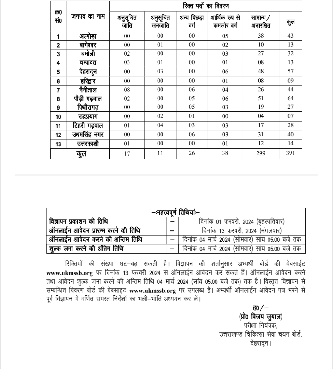 उत्तराखंड : बेरोजगारों के लिए अच्छी खबर, चिकित्सा स्वास्थ्य एवं परिवार कल्याण विभाग में 391 पदों पर निकली भर्ती, इनके लिए बड़ा मौका