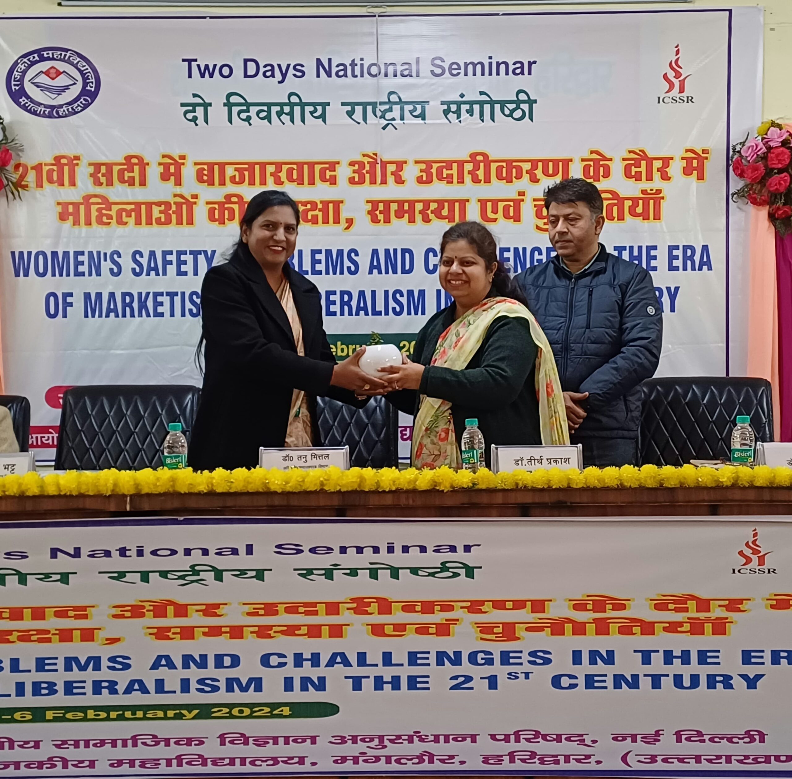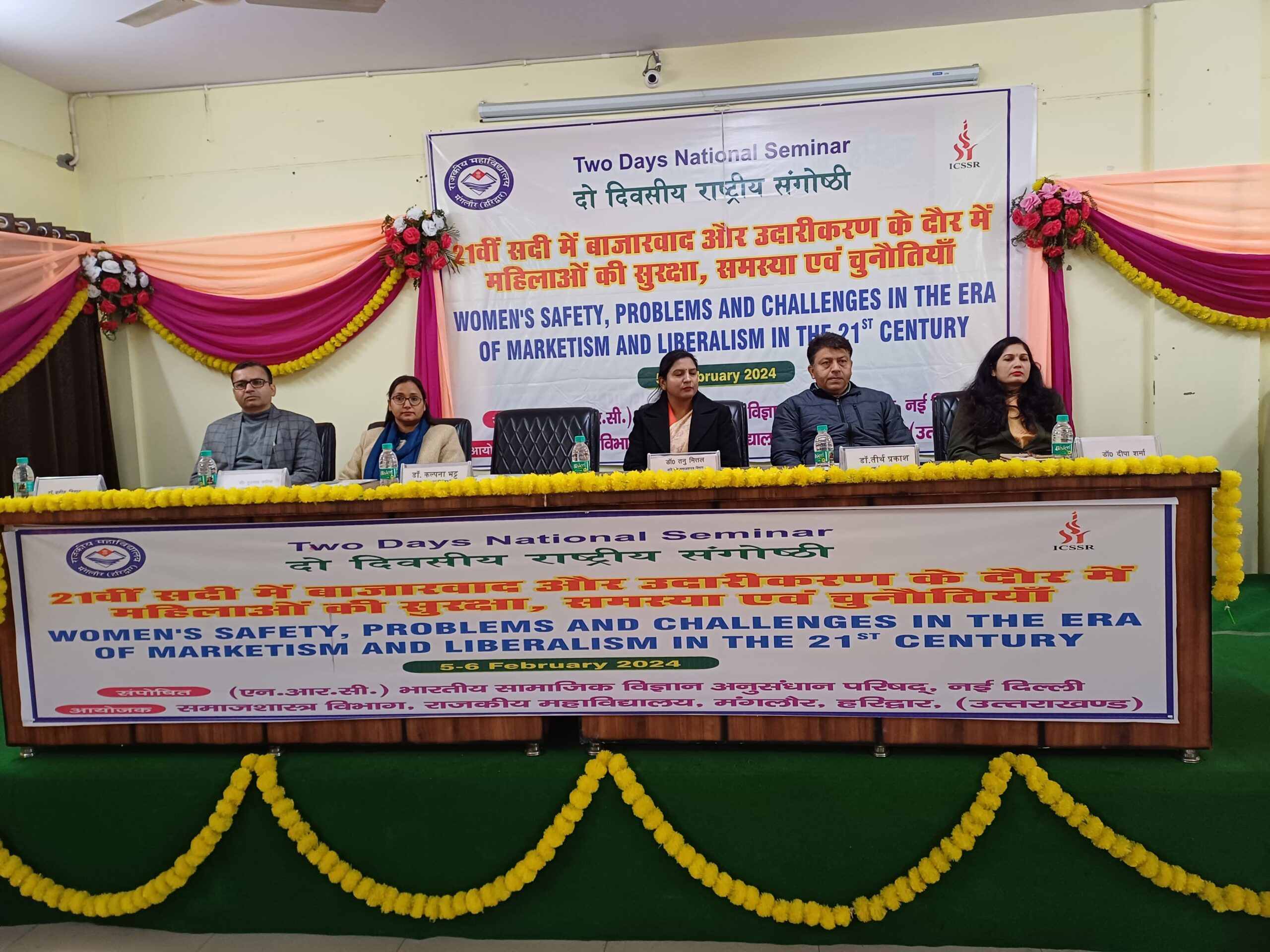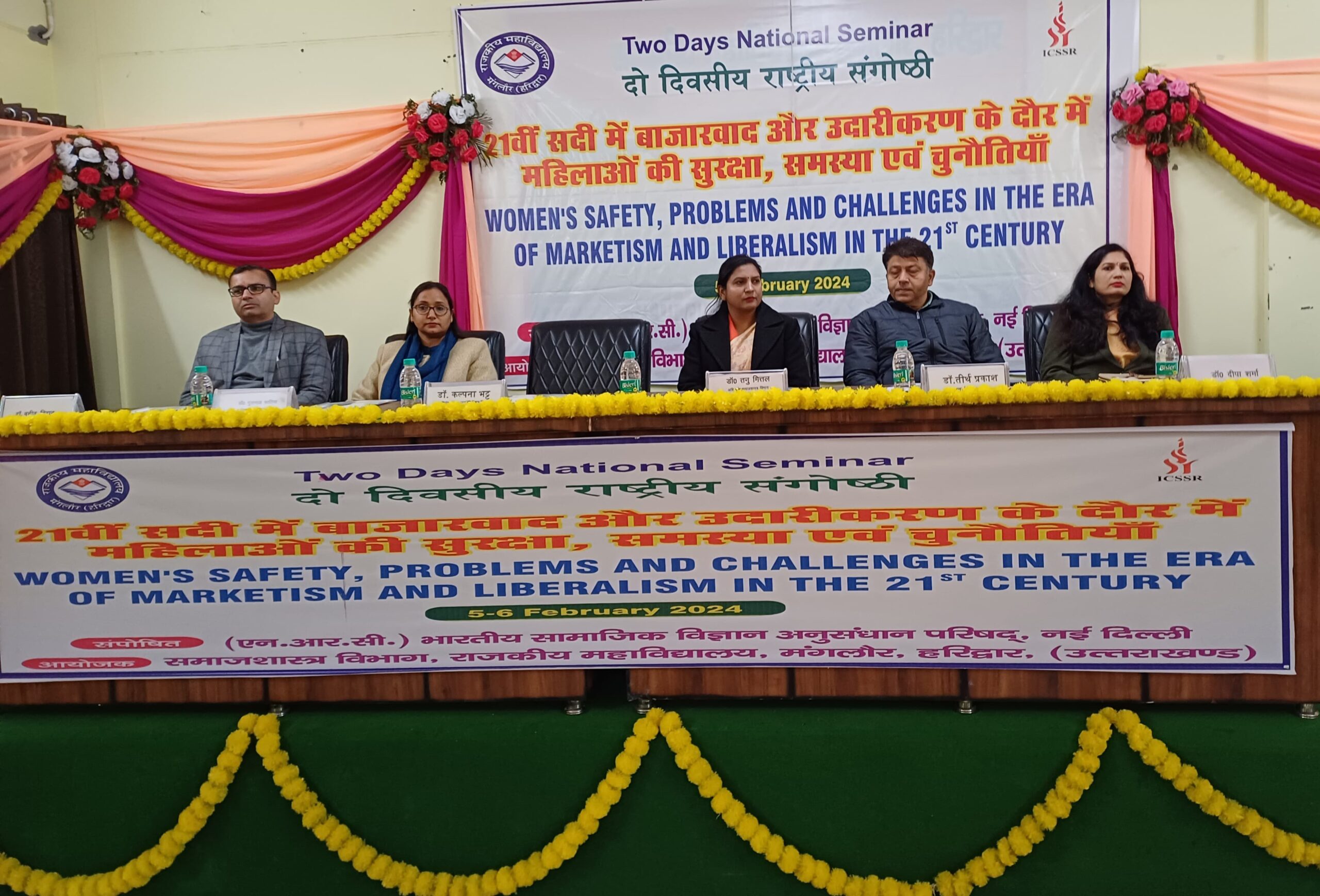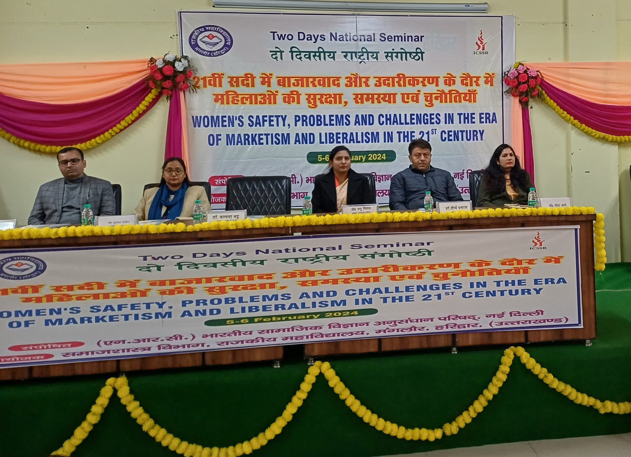 मंगलौर/रूडकी : राजकीय महाविद्यालय मंगलौर हरिद्वार ने उच्च शिक्षा में नयी ऊँचाइयों को प्राप्त करते हुए समाजशास्त्र विभाग द्वारा “21 वीं सदी में बाजारवाद और उदारीकरण के दौर में महिलाओं की सुरक्षा, समस्या एवं चुनौतियाँ” विषय पर दो दिवसीय राष्ट्रीय संगोष्ठी के समापन दिवस पर इस संगोष्ठी के मुख्य अतिथि, डॉ. तनु मित्तल राजकीय स्नात्तकोतर महाविद्यालय नई टिहरी विशिष्ट अतिथि डॉ. बबित विहान एसो. प्रो. राजकीय महाविद्यालय जखौली, मुख्य वक्ता डॉ. कल्पना भटट् एसो. प्रो. धनौरी पीजी कॉलेज धनौरी, डॉ. गुलनाज फात्मा असि. प्रो. समाजशास्त्र पीजी कॉलेज धनौरी, ने दीप प्रज्जवलित कर सरस्वती वंदना करी। इसके उपरान्त संगोष्ठी का संचालन कर रहे डॉ. प्रवेश त्रिपाठी ने आंमत्रित अतिथियों का स्वागत करने के लिए भारती, असमा, अमीशा, इत्यादि छात्राओं को निमंत्रित किया। महाविद्यालय के प्राचार्य डॉ. तीर्थ प्रकाश ने सभी अतिथियों का स्वागत करते हुए राष्ट्रीय संगोष्ठी को सफल होने के लिए शुभकामनायें दी।