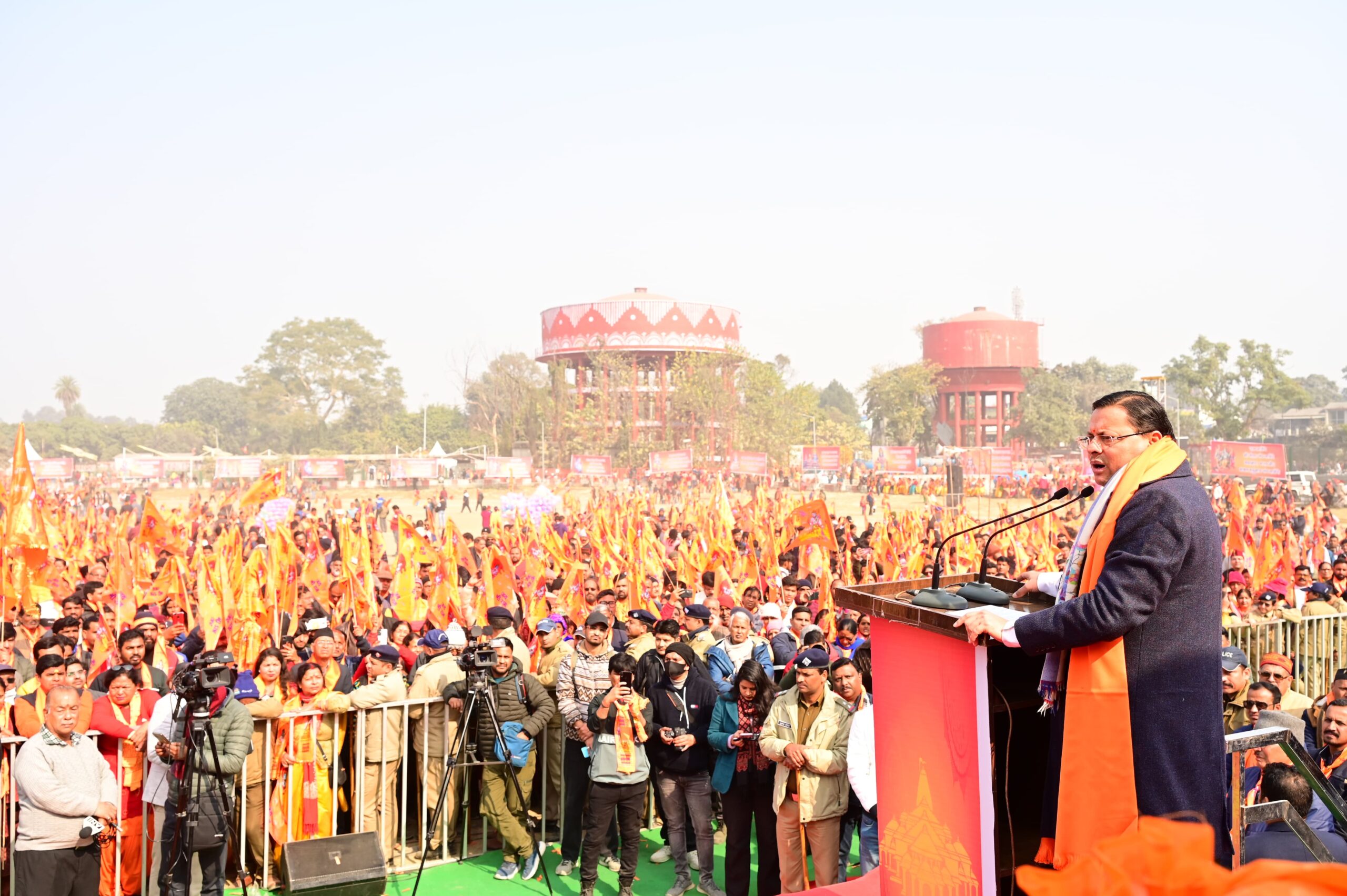 देहरादून : मुख्यमंत्री पुष्कर सिंह धामी ने शनिवार को परेड ग्राउंड देहरादून में श्री राम मंदिर प्राण प्रतिष्ठा उत्सव समिति, द्वारा आयोजित “राम राज्य शोभायात्रा” कार्यक्रम में प्रतिभाग किया। इस दौरान मुख्यमंत्री पुष्कर सिंह धामी ने कहा कि सभी राम भक्तों का 500 से अधिक वर्ष का इंतजार खत्म होकर भव्य राम मंदिर बनने का सपना पूरा हो रहा है। हजारों साधु संतों राम भक्तों, सनातन प्रेमियों के बलिदान के उपरांत इस पुण्य दिन के हम सब साक्षी बनेंगे।