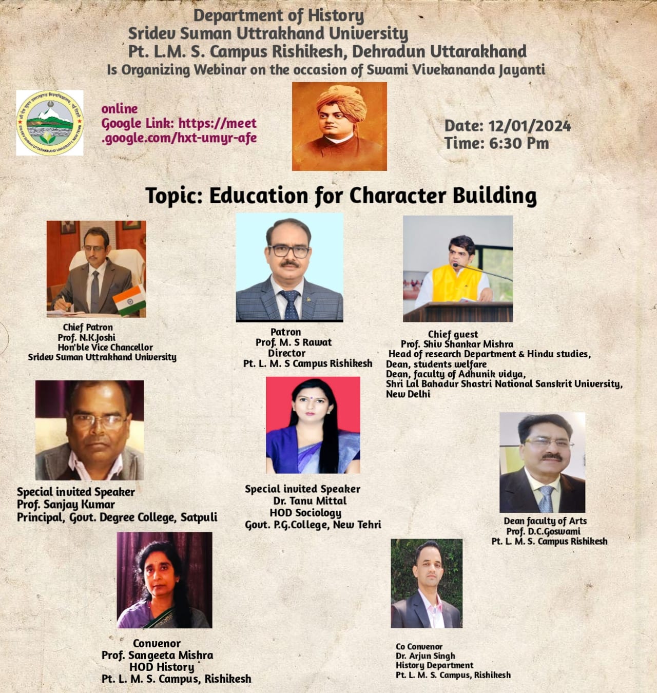स्वामी विवेकानंद जयंती पर SDSU विश्वविद्यालय के पंडित ललित मोहन शर्मा कैंपस ऋषिकेश के इतिहास विभाग द्वारा चरित्र निर्माण के लिए शिक्षा विषय पर ऑनलाइन वेबीनार का किया आयोजन
