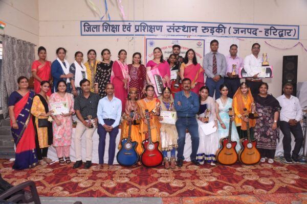 रूडकी : जिला शिक्षा एवं प्रशिक्षण संस्थान रुड़की में संगीत प्रतिभा सम्मान समारोह 2023 का आयोजन डायट प्राचार्य केके गुप्ता के निर्देशानुसार आयोजित किया गया विकास खंड पर प्रतिभाग करने वाले विद्यार्थियों एवं शिक्षकों को चयन के उपरांत सम्मान समारोह में प्रतिभाग करने का अवसर प्राप्त हुआ प्रतिभा सम्मान समारोह में शिक्षकों एवं विद्यार्थियों ने गायन एवं नृत्य की विधाओं में प्रतिभा किया।शिक्षकों की विधाओं में आर्य कन्या इंटर कॉलेज से कंचन मल्होत्रा एवं केवल कन्या पाठशाला मंगलौर से प्रिया प्रथम रही। विद्यार्थियों की विधाओं में आर्य कन्या इंटर कॉलेज की विद्यार्थी मंतशा एवं एसएसडीपीसी की छात्रा बुशरा अंसारी प्रथम रही। यह शिक्षक एवं विद्यार्थी राज्य स्तर पर होने वाले संगीत प्रतिभा सम्मान समारोह में प्रतिभा करने के लिए देहरादून जाएंगे।
