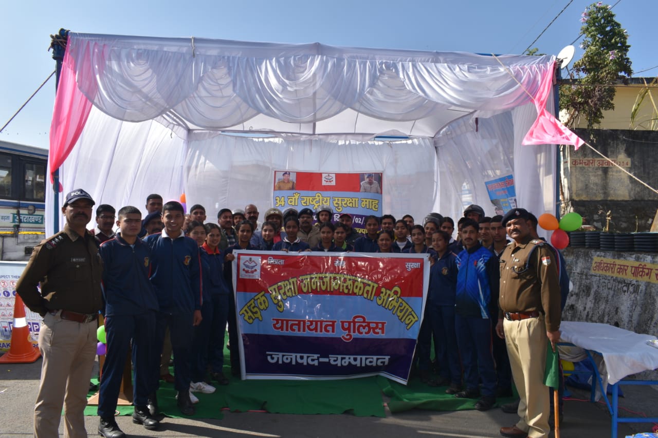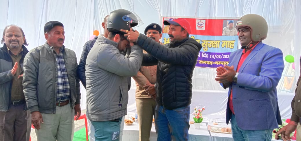 34 वें सड़क सुरक्षा माह के अवसर पर यातायात जागरूकता हेतु बाईक रैली से पूर्व पुलिस अधीक्षक जनपद चम्पावत अजय गणपति व हेल्मेट मैन ऑफ इण्डिया राघवेन्द्र द्वारा उपस्थित युवाओं को हेल्मेट वितरित किये गये व सदैव दोपहिया वाहन में हेल्मेट पहनने हेतु प्रेरित किया गया। पुलिस अधीक्षक चम्पावत द्वारा सड़क सुरक्षा के प्रति जागरुक करते हुए कहा कि सड़क पर सुरक्षा की जिम्मेदारी सबकी है सड़क एक ऐसा स्थान है जिसका उपयोग छोटे बच्चे से लेकर बुजुर्ग तक हर कोई करता है। इसलिए सड़क पर स्वयं एवं दूसरों की सुरक्षा के लिए यातायात नियमों का पालन करना जरुरी है। दोपहिया वाहन में तीन सवारी नही बैठाने, रैश ड्राईविंग नही करने, टैक्सी चालकों को सीट बेल्ट का प्रयोग करने, वाहन चलाते समय मोबाईल फोन का प्रयोग नहीं करने, ओवर स्पीड/ओवर सवारी नही बैठाने और शराब पीकर वाहन नहीं चलाने की अपील की गई साथ ही सड़क दुर्घटना में घायल व्यक्ति की हरसंभव सहायता करने हेतु प्रेरित किया गया। साथ ही साथ यह भी जानकारी दी गयी कि यदि कोई व्यक्ति साईबर ठगी का शिकार होता है तो तत्काल नजदीकी पुलिस स्टेशन, साईबर सैल के टोल फ्री न0- 1930, चम्पावत या साईबर क्राईम पोर्टल https://cybercrime.gov.in पर जाकर भी अपनी शिकायत दर्ज करा सकते है। नशे के विरूद्ध अभियान चलाकर नशे से दूर रहने हेतु आमजन को जागरूक किया गया।