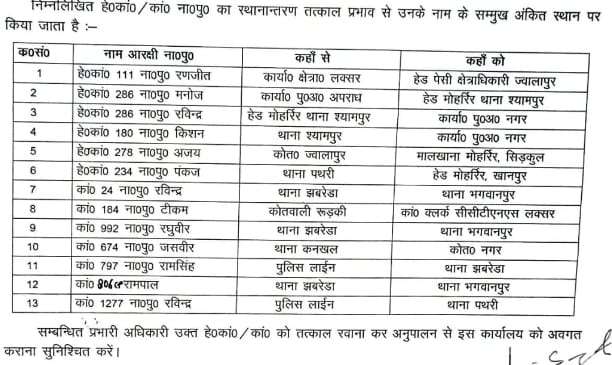 एसएसपी अजय सिंह ने 03 उपनिरीक्षक, 04 ASI, 06 हेड कांस्टेबल एवं 07 कांस्टेबल का किया स्थानान्तरण, देखें सूचि September 3, 2023 उत्तराखंड हरिद्वार : एसएसपी अजय सिंह ने 03 उपनिरीक्षक, 04 ASI, 06 हेड कांस्टेबल एवं 07 कांस्टेबल के स्थानान्तरण किया हैं. देखें सूचि