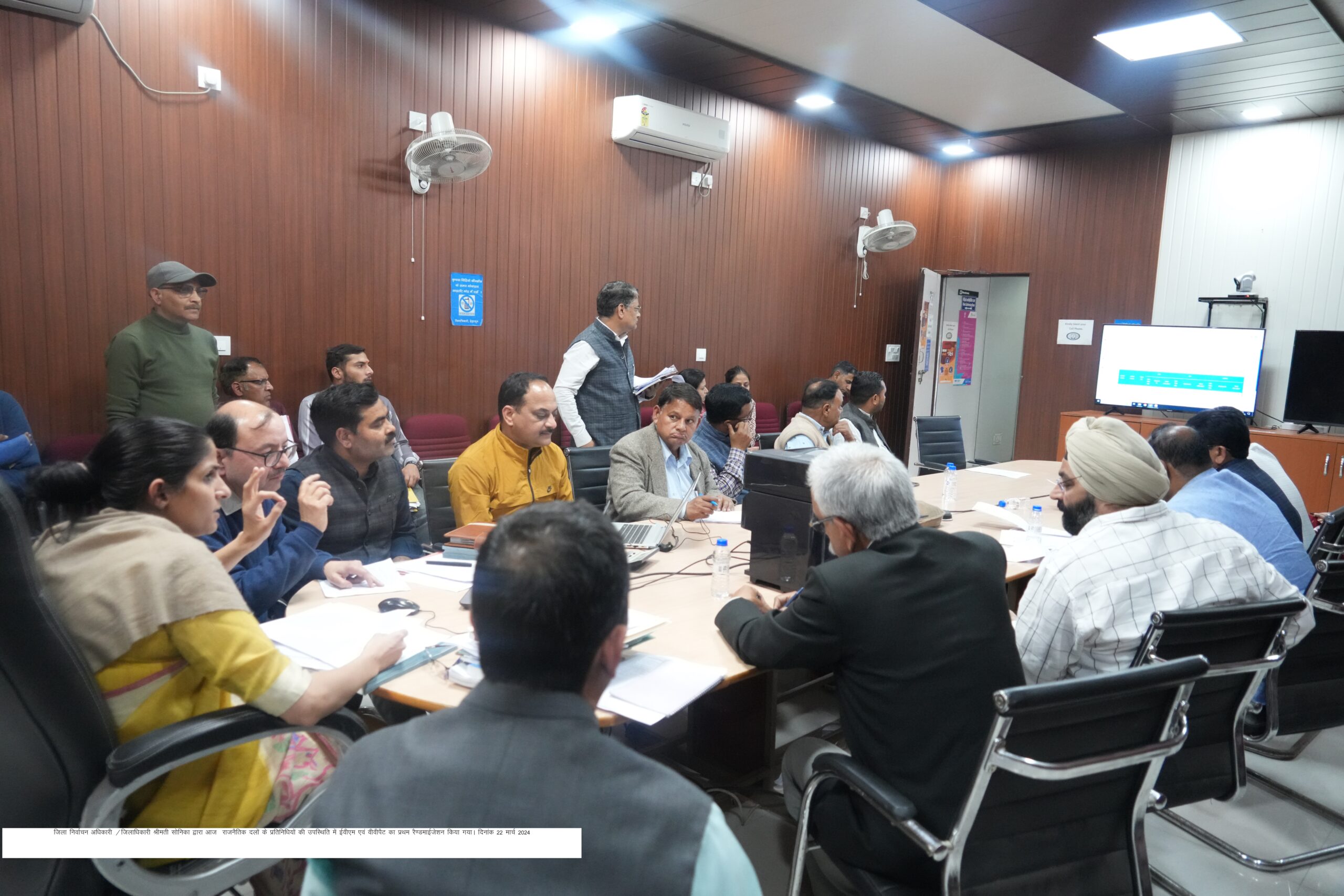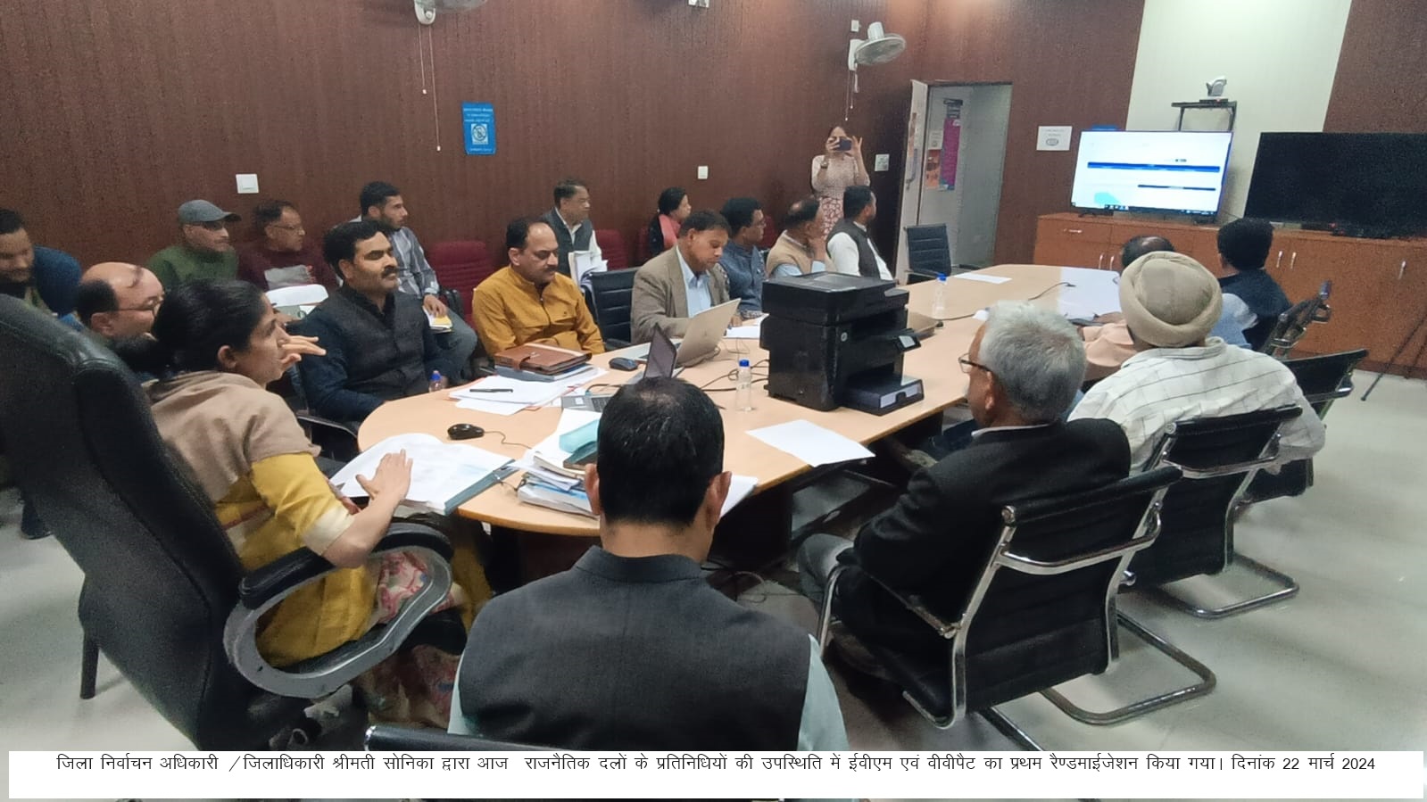 देहरादून : रिटर्निंग अधिकारी-01 टिहरी गढवाल संसदीय क्षेत्र/जिला निर्वाचन अधिकारी देहरादून/जिलाधिकारी सोनिका की अध्यक्षता में एनआईसी सभागार में लोकसभा सामान्य निर्वाचन-2024 के सम्पादनार्थ ईवीएम/वीवीपैट मशीनों का प्रथम रैण्डमाईजेशन राजनैतिक दलों के प्रतिनिधियों की उपस्थिति में किया गया। प्रथम रैण्डमाईजेशन में 5791 बीयू, 4109 सीयू तथा 3276 वीपीपैट का रैण्डमाईजेशन किया गया। इस अवसर पर भाजपा से अरविन्द जैन, कांग्रेस से डॉ जसविन्दर सिंह व शहजाद अंसारी, सीपीआई(एम) से अनन्त आकाश, आप से चौ. रविन्द्र कुमार, बसपा से दिगविजय सिंह, अपर जिलाधिकारी प्रशासन जयभारत सिंह, अपर जिलाधिकारी वित्त एवं राजस्व रामजीशरण शर्मा, सहित समस्त एआरओ उपस्थित रहे।
