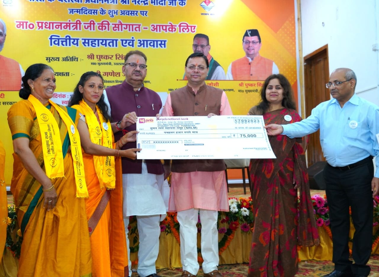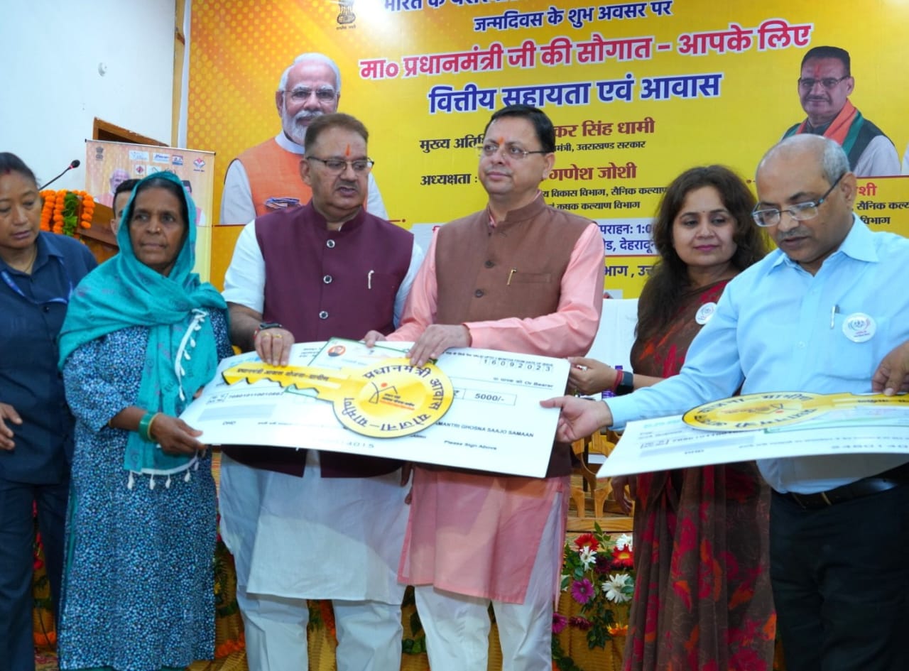 देहरादून : मुख्यमंत्री पुष्कर सिंह धामी ने रविवार को मुख्यमंत्री आवास स्थित मुख्य सेवक सदन में प्रधानमंत्री नरेन्द्र मोदी के जन्म दिवस के अवसर पर ‘ प्रधानमंत्री की सौगात-आपके लिए’ कार्यक्रम में राष्ट्रीय ग्रामीण आजीविका मिशन के अन्तर्गत स्वयं सहायता समूहों एवं प्रधानमंत्री आवास योजना-ग्रामीण के अन्तर्गत 11 लाभार्थियों को आवास स्वीकृति पत्र, चाबी एवं घर के लिए बर्तन और सामान क्रय के लिए 05-05 हजार रुपये के चेक प्रदान किये। मुख्यमंत्री ने कहा कि प्रधानमंत्री आवास योजना-ग्रामीण के लाभार्थियों को अब घर के बर्तन और सामान के लिए 06-06 हजार रुपये दिये जायेंगे।