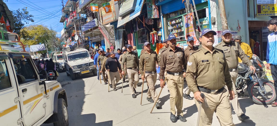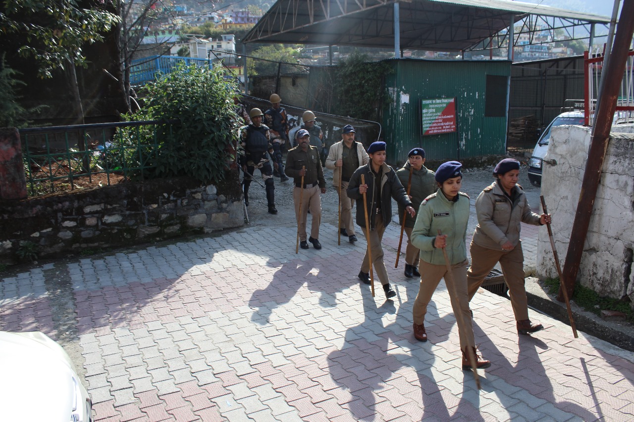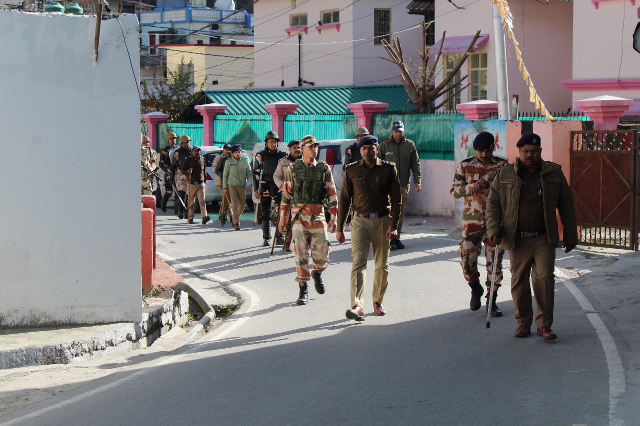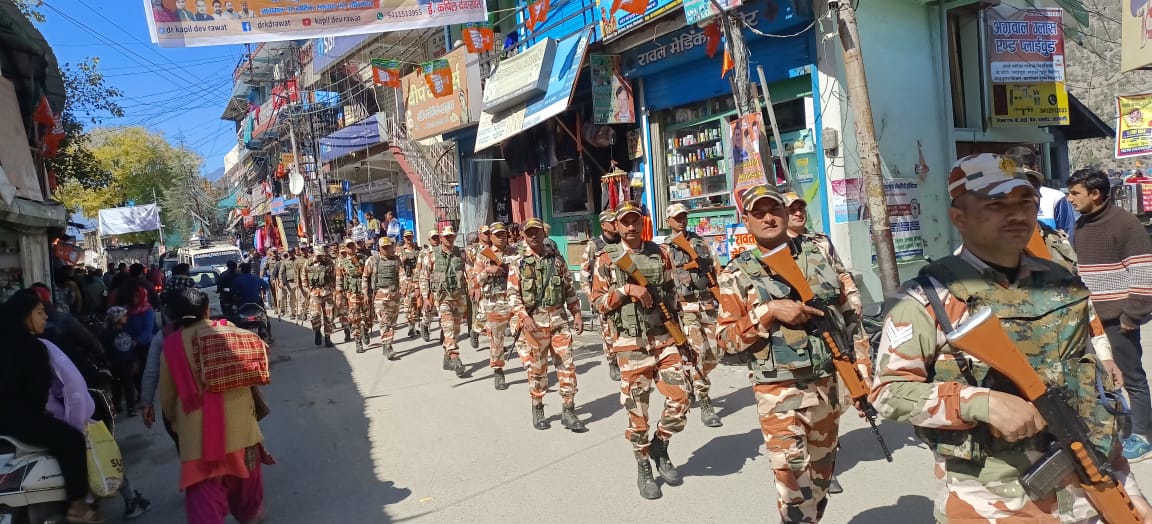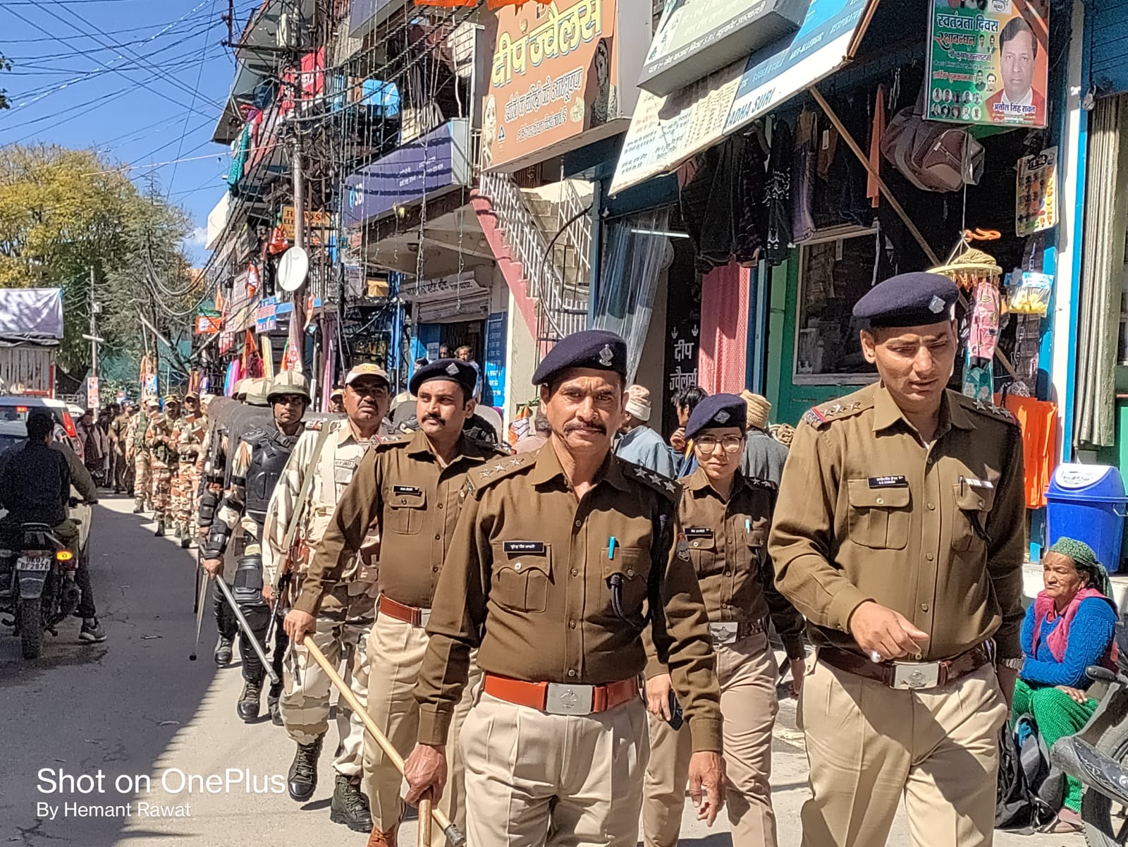 उत्तरकाशी पुलिस व पैरामिलिट्री फोर्स ने किया फ्लैग मार्च