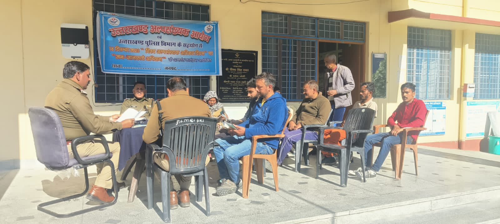 उत्तरकाशी (कीर्ति निधि सजवाण):  पुलिस अधीक्षक उत्तरकाशी यदुवंशी के दिशा-निर्देशन में विश्व अल्पसंख्यक अधिकार दिवस के अवसर पर उत्तरकाशी पुलिस के समस्त कोतवाली/थाना प्रभारियों द्वारा थाना परिसर में अल्पसंख्यक समुदाय के व्यक्तियों के साथ गोष्ठी का आयोजन किया गया। इस दौरान उपस्थित अल्पसंख्यक समुदाय के व्यक्तियों को उनके अधिकारों, अल्प संख्यक समुदाय के लोगो के कल्याण के लिये राज्य/केन्द्र सरकार द्वारा चलाई जा रहे विभिन्न योजनाओं एवं संवैधानिक अधिकारों में प्रचलित कानून, नियम व सुविधाओं, उत्तराखण्ड पुलिस द्वारा अल्पसंख्यकों कल्याण एवं हितों की सक्षा हेतु किये जा रहे कार्यों आदि के बारे में जानकारियां प्रदान कर जागरुक किया गया। गोष्ठी के दौरान अल्पसंख्यक समुदाय के व्यक्तियों से उनकी समस्याएं पूछकर उनका समाधान किया गया।