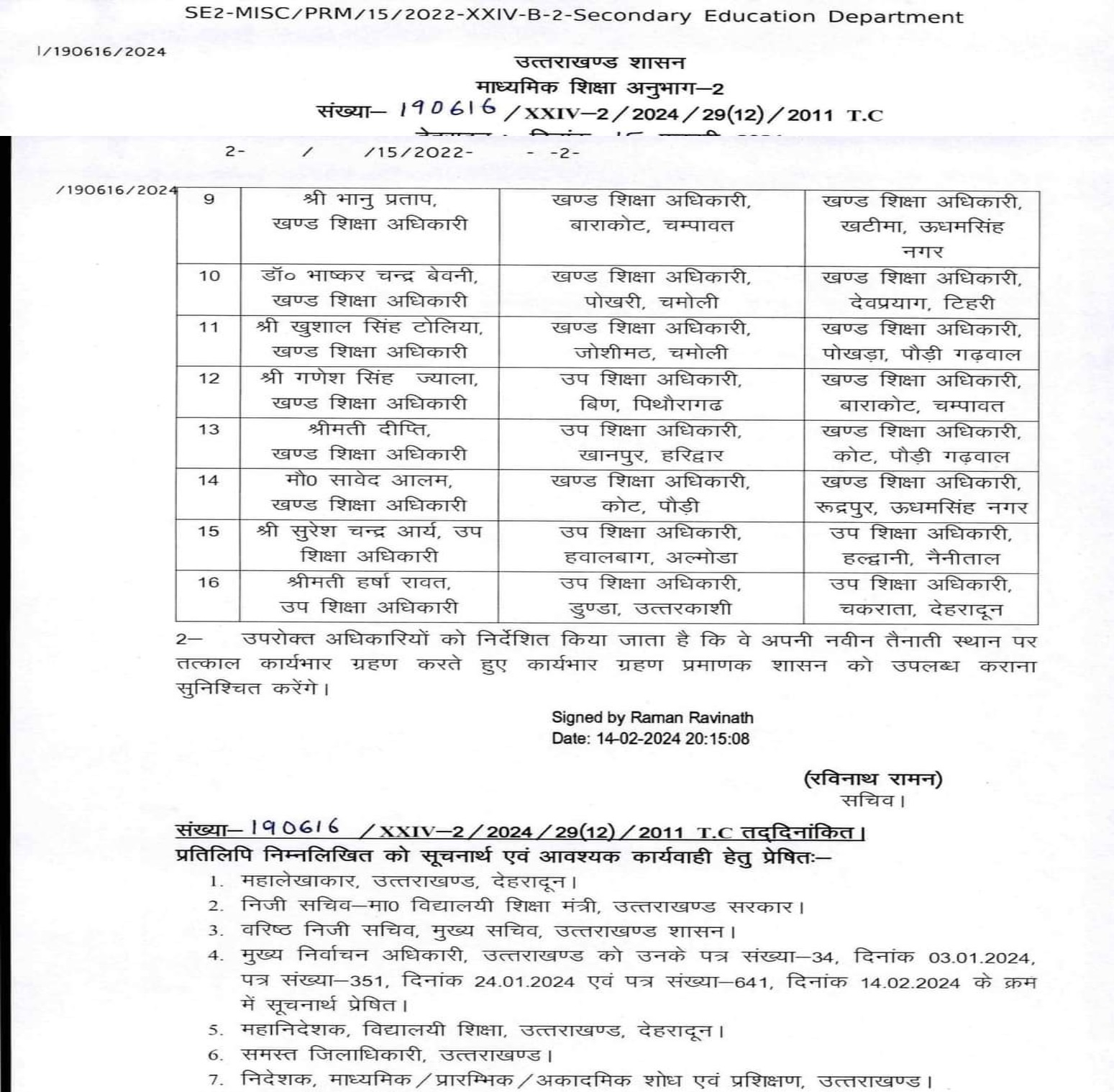 उत्तराखंड : शिक्षा विभाग ने किये अधिकारियों के स्थानान्तरण, देखें सूचि Admin February 15, 2024 उत्तराखंड देहरादून : शिक्षा विभाग में बड़े स्तर पर अधिकारियों के ट्रांसफर हुए हैं। एक उप शिक्षा निदेशक के साथ ही विभिन्न जिलों के खंड शिक्षा अधिकारियों को बदला गया है। आप अपने खंड शिक्षा अधिकारियों के नाम नीचे दी गई लिस्ट में देख सकते हैं।