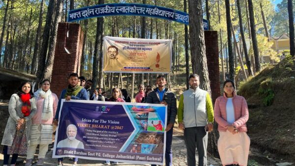 लैंसडाउन : भक्त दर्शन राजकीय स्नातकोत्तर महाविद्यालय जयहरीखाल में विकसित भारत @2047 पहल के अंतर्गत विकसित भारत संकल्प यात्रा का आयोजन किया गया । विकसित भारत संकल्प यात्रा को हरी झंडी देते हुए महाविद्यालय प्राचार्य प्रो एल आर राजवंशी ने कहा कि देश की राष्ट्रीय योजनाओं, प्राथमिकताओं और लक्ष्यों के निर्माण में देश के युवाओं को सक्रिय रूप से सम्मिलित करने के प्रधानमंत्री जी के दृष्टिकोण के अनुरूप, ‘विकसित भारत @2047: युवाओं की आवाज़’ पहल विकसित भारत @2047 के दृष्टिकोण में विचारों का योगदान करने के यह यात्रा छात्र छात्राओं का उत्साह वर्धन करेगी। उन्होंने कहा कि देश के समस्त शैक्षणिक संस्थानों में आयोजित हो रही यह कार्यशालाएँ विकसित भारत @2047 के लिए अपने विचारों और सुझावों को साझा करने के लिए युवाओं को सम्मिलित करने की दिशा में एक महत्वपूर्ण कदम होंगी। कार्यक्रम समन्वयक डॉ विनीता ने छात्र छात्राओं को विकसित भारत से जुड़े आइडियाज पोर्टल को विस्तार से समझाया और बताया कि 5 अलग-अलग विषयों पर सुझाव दिए जा सकते हैं जिसमें सर्वश्रेष्ठ 10 सुझावों के लिए पुरस्कार की भी व्यवस्था की गई है। डॉ शिप्रा ने छात्र छात्राओं को संबोधित करते हुए कहा कि आज हर संस्था, हर व्यक्ति को इस संकल्प के साथ आगे बढ़ना चाहिए कि हर प्रयास और कार्य विकसित भारत के लिए होगा । इस अवसर पर महाविद्यालय के समस्त छात्र छात्राएं एवम् प्राध्यापक उपस्थित रहे ।