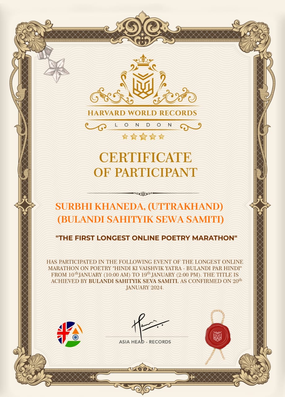गोपेश्वर : हॉवर्ड वर्ल्ड रिकॉर्ड (लंदन) में सम्मिलित हुई युवा कवयित्री सुरभि खनेड़ा l दुनिया के सबसे बड़े कवि सम्मेलन में प्रतिभाग कर विश्व रिकॉर्ड में अपना नाम दर्ज करवा कर गोपेश्वर की युवा कवयित्री सुरभि खनेड़ा ने बढ़ाया शहर का मान बुलंदी संस्था द्वारा विश्व हिंदी दिवस से प्रारंभ हिंदी की वैश्विक यात्रा बुलंदी पर हिंदी अनवरत कवि सम्मेलन को हॉवर्ड वर्ल्ड रिकॉर्ड द्वारा विश्व रिकॉर्ड में सम्मिलित किया गया है उक्त आयोजन में दुनिया के 55 देशों के हिंदी कवियो सहित 1205 कलमकारो ने प्रतिभाग किया साथ ही यह आयोजन 220 घंटे अनवरत आयोजित हुआ l हॉवर्ड वर्ल्ड रिकॉर्ड द्वारा सबसे ज्यादा देशों की सहभागिता सहित अनवरत 220 घंटे आयोजित होने पर यह आयोजन विश्व रिकॉर्ड में सम्मिलित किया गया है l